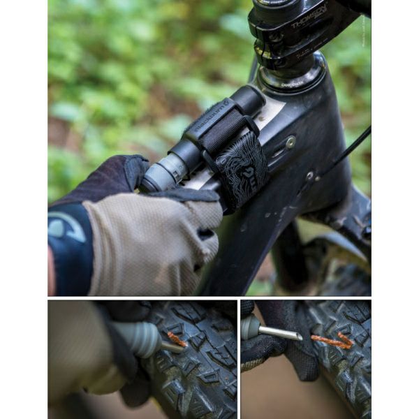 チューブレスタイヤは絶対パンクしないだって?そんなこと嘘にきまっている。パンクした時でも、素早くワンショットでチューブレスタイヤの穴を防ぐ方法がある。それもわずか数秒でフラットタイヤを元に戻せる方法だ。トップチューブにバンドで固定できるようになっているから、是非フレームに取り付けてみてほしい。もしくはシャークナイフのように足首に忍ばせておくことだって可能だ。だが本当にその問題に直面するまでそれは閉じておこう。素早く出せるように。