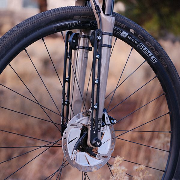 こちらのアクスルパックを使用することでマウンテンバイクのサスペンションフォークやロードバイクのダボ穴がない車種にもカーゴケージなどを取り付け可能に。